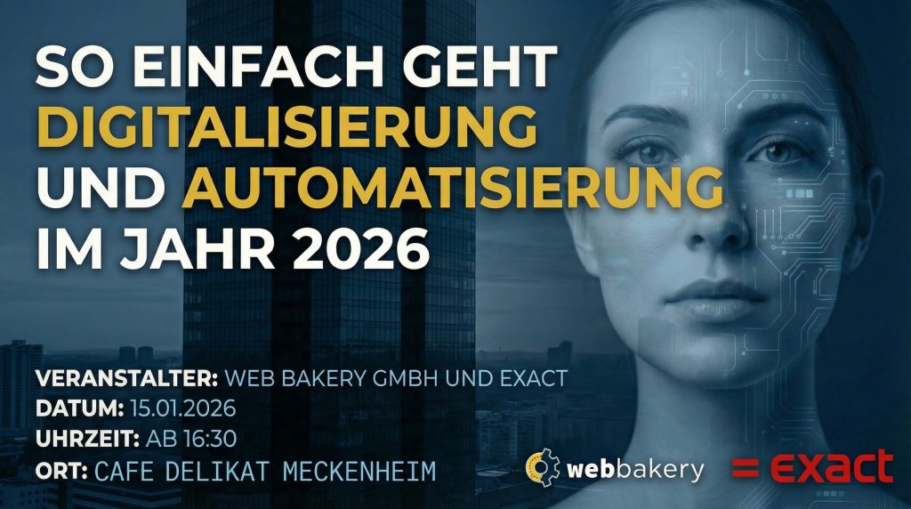 Gemeinsam mit Exact ERP laden wir von Web Bakery herzlich zu einem entspannten Afterwork-Get-together für lokale Unternehmen ein. Im Mittelpunkt stehen der offene Austausch, praxisnahe Impulse und das Kennenlernen anderer Unternehmer:innen aus der Region – ganz ohne Sales-Pitch.